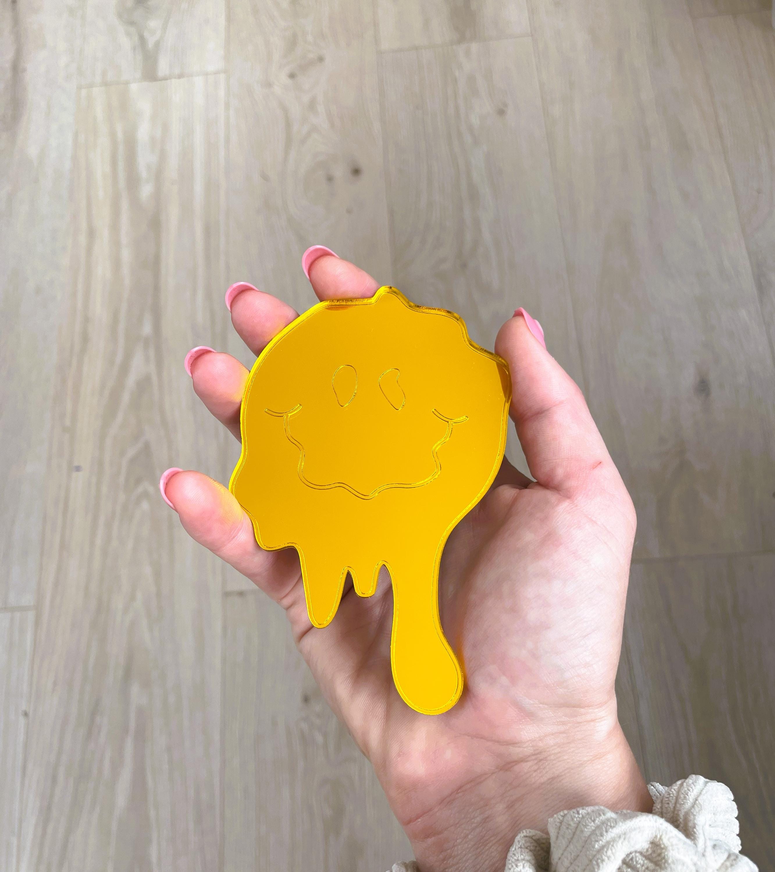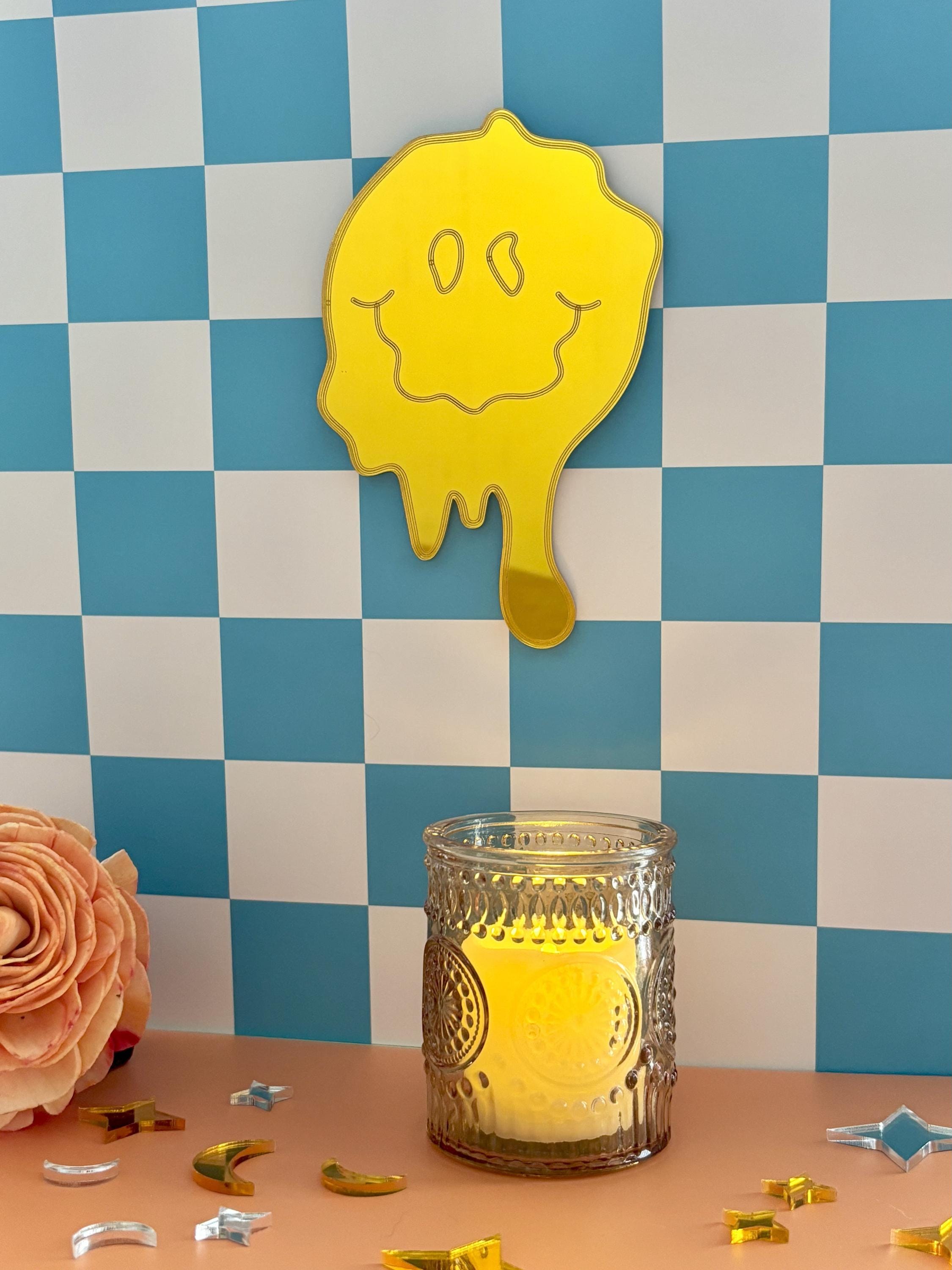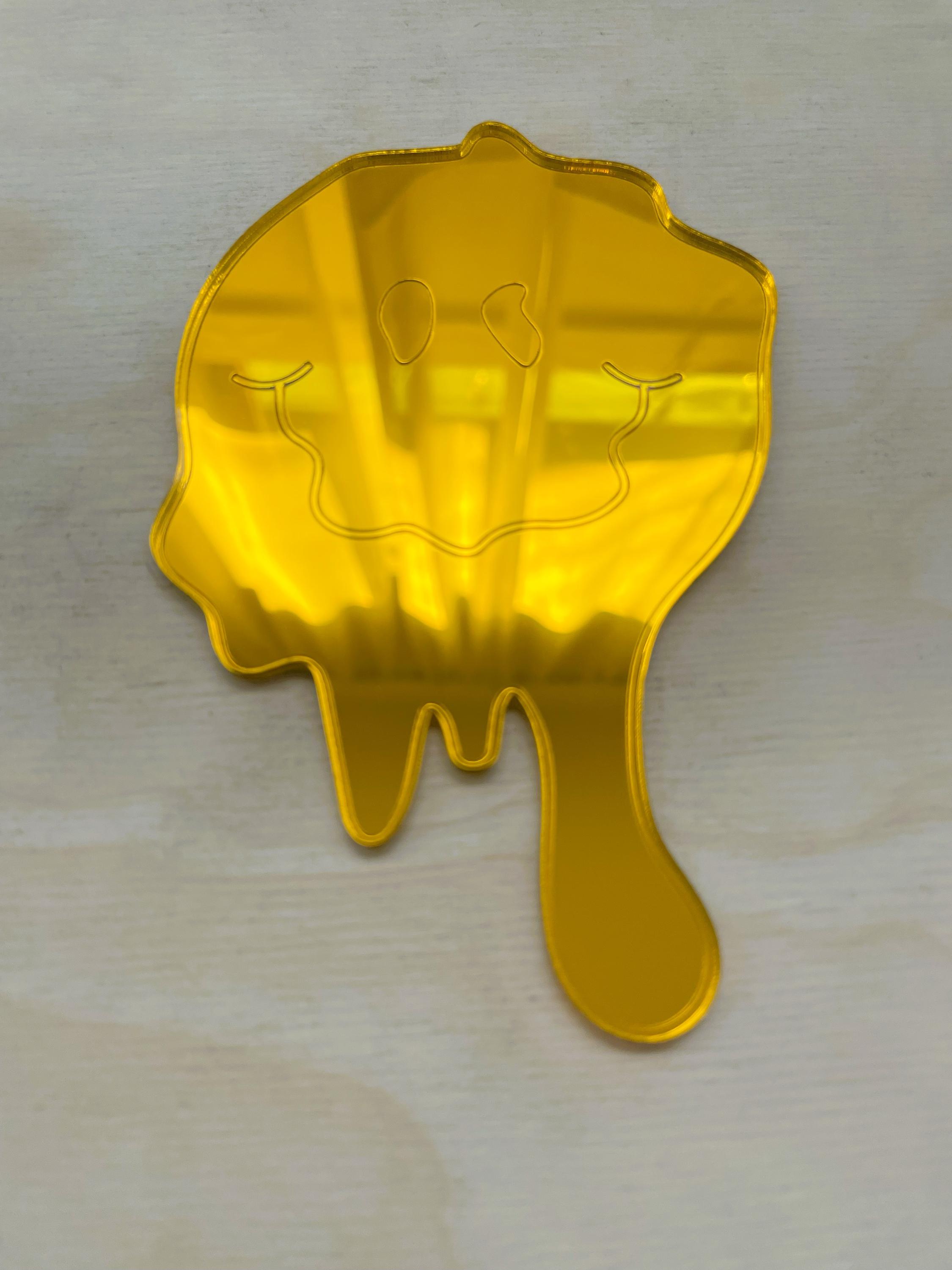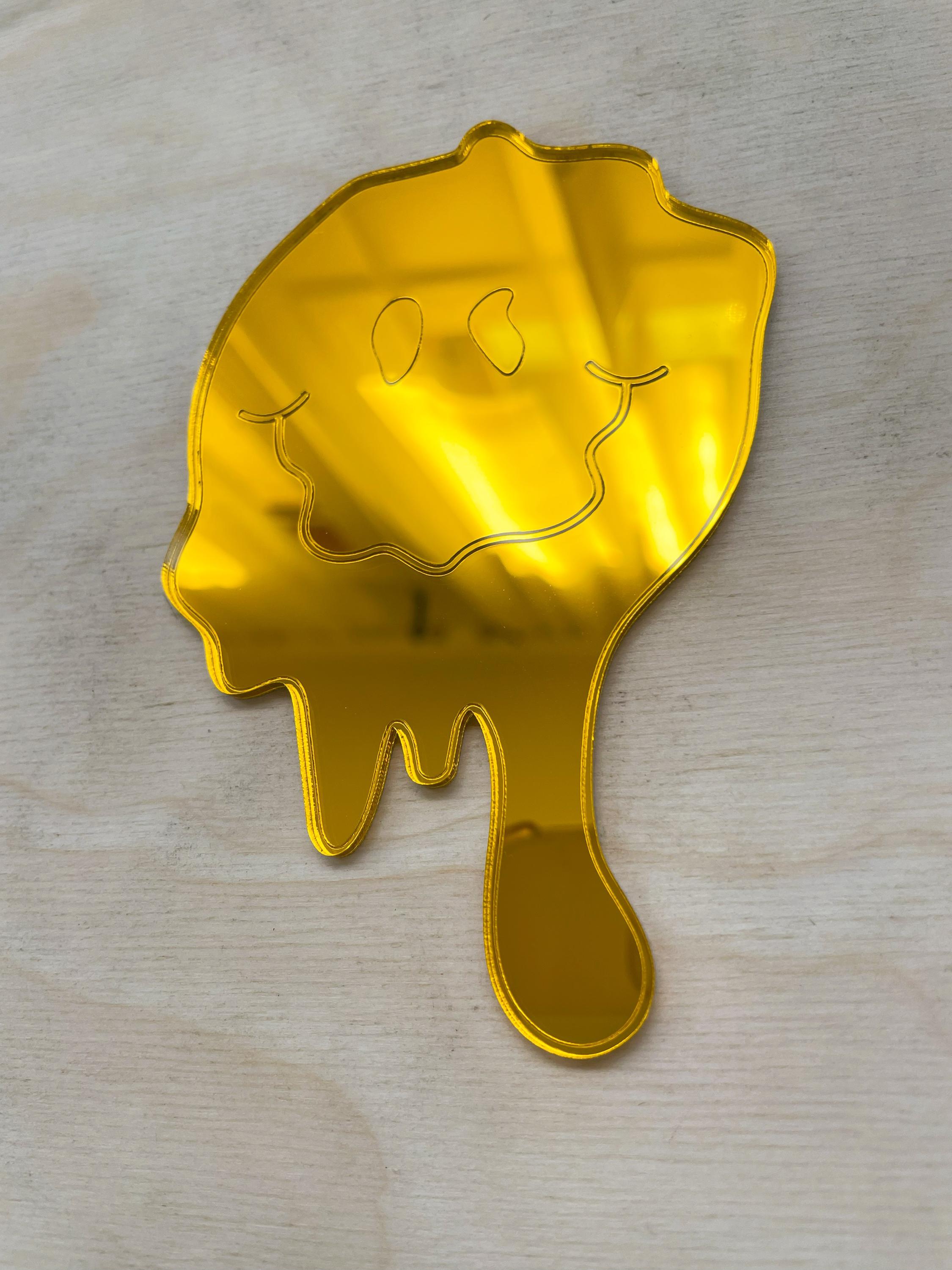 Bring good vibes and groovy style to your space with this drippy smiley face mirror! Engraved on shiny gold acrylic, it’s the perfect mix of playful and modern. A fun statement piece for any wall — handmade and totally unique.